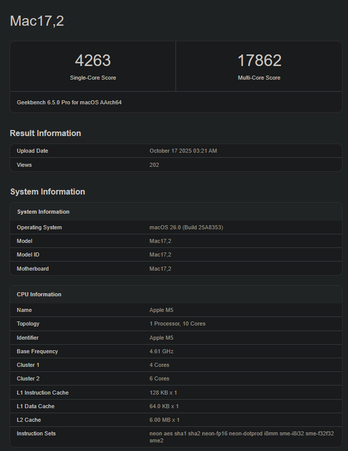W teście jednordzeniowym Geekbench uzyskuje wynik 4,263, dzięki czemu Apple M5 jest o około 13% szybszy niż Apple M4 (średnio 3,748). W teście wielordzeniowym, M5 uzyskuje 17 862 punktów; 17% wzrost w stosunku do swojego odpowiednika ostatniej generacji (15 173 punktów ze względu na dodatkowe rdzenie procesora).