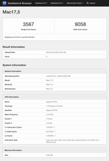 Podobnie, wydajność wielordzeniowego procesora wskazuje, że MacBook Neo jest nieznacznie mocniejszy niż MacBook Air M1. Z drugiej strony, średnia dla pojedynczego rdzenia wynosząca 3530 punktów jest prawie o 50% wyższa niż w przypadku tego samego MacBooka z 2363 punktami. Wysyłka, Apple M2-napędzane MacBooki, model A18 Pro pomaga MacBookowi Neo uzyskać wynik o około 12,7% wyższy niż nawet aktywnie chłodzony MacBook Pro 14 M3. W rzeczywistości, MacBook Neo plasuje się tuż za urządzeniami Apple generacji M4 w obciążeniach jednordzeniowych. Proszę zobaczyć nasz artykuł o premierze MacBooka Neo aby uzyskać więcej informacji na temat Apple MacBooka za 599 USD.