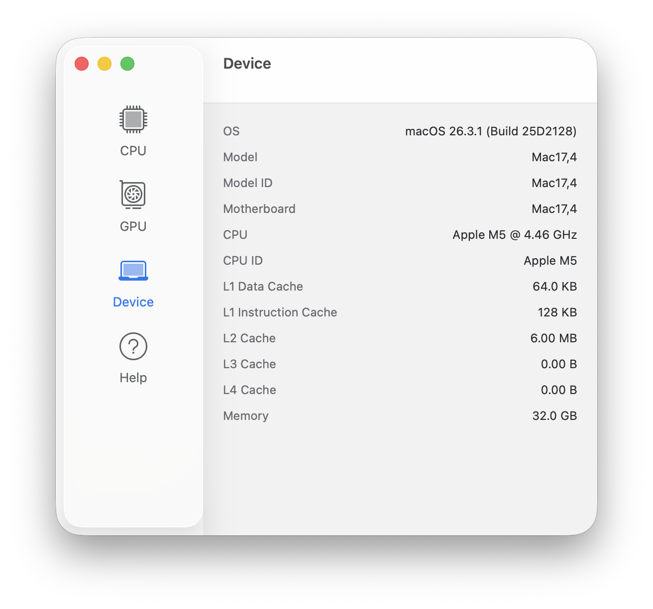W naszych testach porównawczych procesorów nowy model M5 jest o 14% szybszy w porównaniu do MacBook Air 15 M4 i o 43% szybszy w porównaniu do MacBooka Air 15 M3. Wydajność procesora nie zmniejsza się na zasilaniu bateryjnym.
