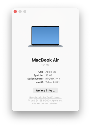 Konstrukcja obudowy, w tym porty, kamera internetowa i urządzenia wejściowe nie zmieniły się w porównaniu do poprzedniego modelu M4tak więc nadal otrzymują Państwo bardzo smukły, ale nie szczególnie lekki laptop o wadze 1,512 kg. Jakość wykonania jest doskonała, zarówno pod względem stabilności, jak i jakości wykonania. Apple zaktualizował moduł Wi-Fi i obsługuje teraz najnowszy standard Wi-Fi 7, w tym Bluetooth 6.0. Szybkość transferu w naszym teście była dobra i stabilna, a także lepsza w porównaniu do mniejszego MacBook Air 13 M5. Poniższe zdjęcia pochodzą z poprzedniej generacji M4.
