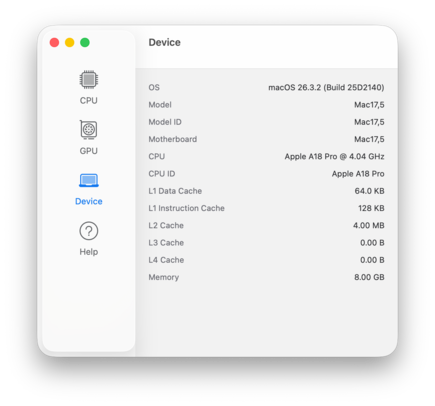| Apple MacBook Neo 256 GB A18 Pro, A18 GPU, Apple SSD AP0256Z, IPS, 2408x1506, 13" | Microsoft Surface Laptop 13 SD X Plus X1P-42-100, Adreno X1-45 1.7 TFLOPS, , IPS, 1920x1280, 13" | HP Omnibook 5 14 SD X Plus X1P-42-100, Adreno X1-45 1.7 TFLOPS, Samsung PM9C1 MZVL81T0HELB-00BTW, OLED, 1920x1200, 14" | Lenovo IdeaPad Slim 3 14 AHP G10 R7 8840HS, Radeon 780M, Micron 2500 MTFDKBA512QGN, IPS, 1920x1200, 14" | Apple MacBook Air 13 M4 Entry M4 10-Core, M4 8-Core GPU, Apple SSD AP0256Z, IPS, 2560x1664, 13.6" | Przeciętny Apple A18 GPU | Średnia w klasie Subnotebook | |