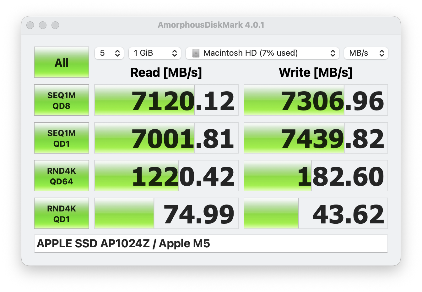 Apple po raz kolejny znacząco zwiększył wydajność dzięki nowemu SoC M5, który jest obecnie zdecydowanie najszybszym jednordzeniowym procesorem dostępnym na rynku. Poprawa wydajności wielordzeniowej i graficznej w stosunku do starego SoC M4 jest teraz jeszcze większa. Dodatkowo, prędkość dysków SSD została zwiększona do poziomu PCIe 4.0.