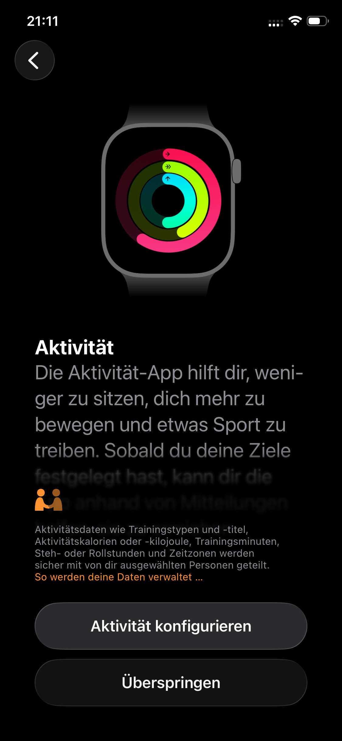 Zegarek Apple można skonfigurować i sparować wyłącznie z telefonem iPhone. Po włączeniu zegarek automatycznie pojawia się jako wyskakujące okienko na pobliskim iPhonie, dzięki czemu proces parowania jest prosty i intuicyjny. Konfiguracja jest w większości intuicyjna, choć zajmuje trochę czasu, ponieważ trzeba przyznać wiele uprawnień.