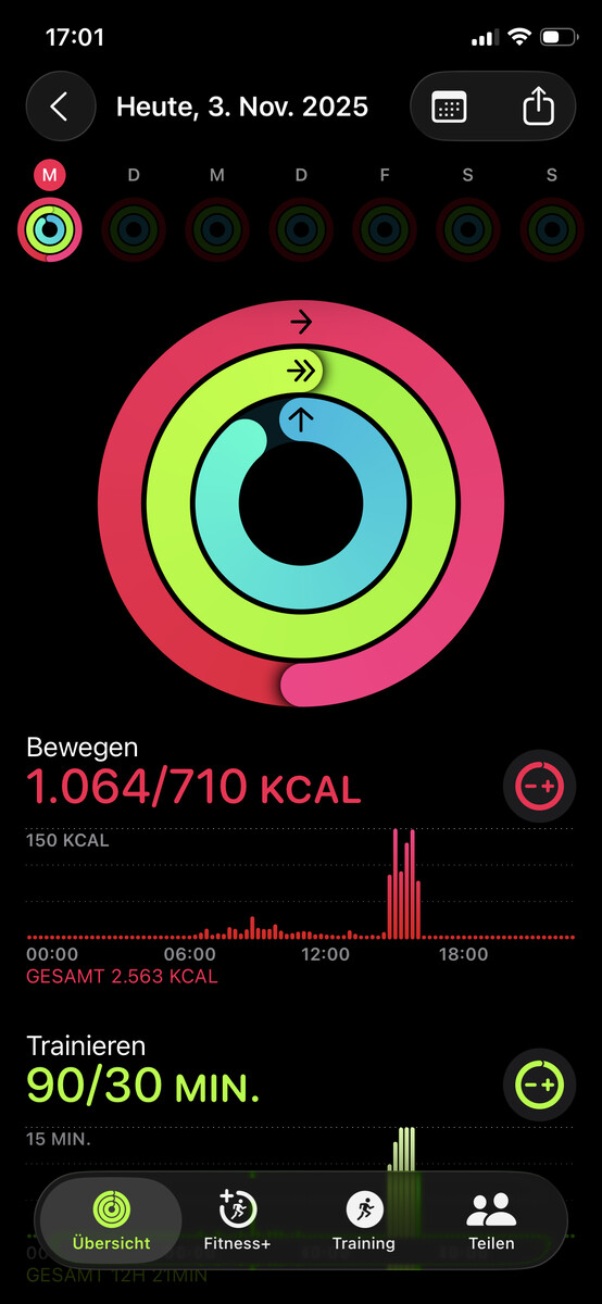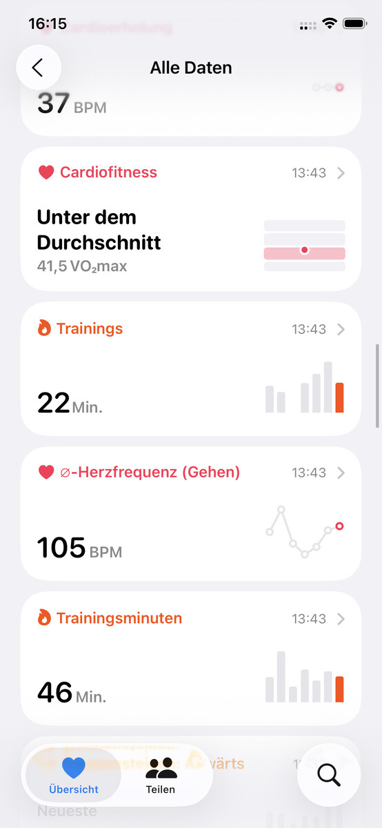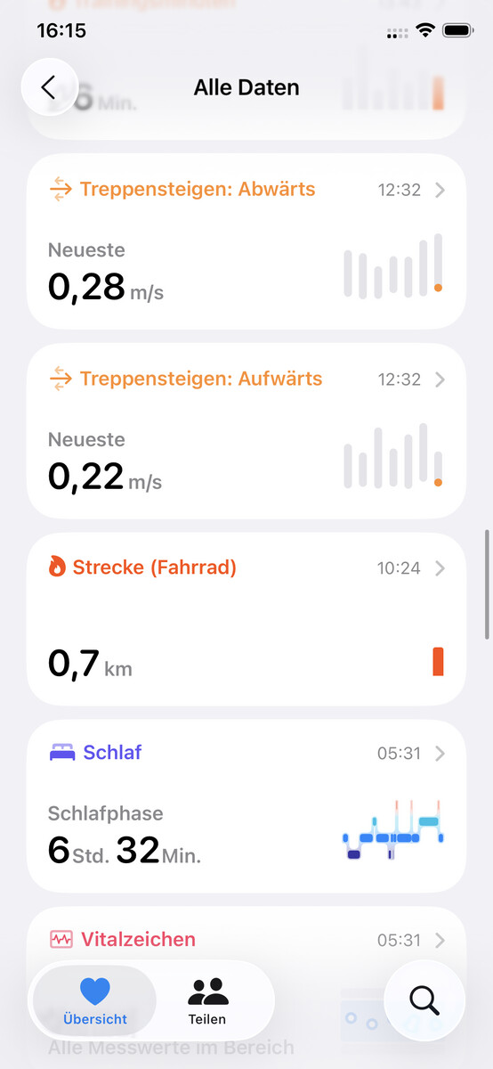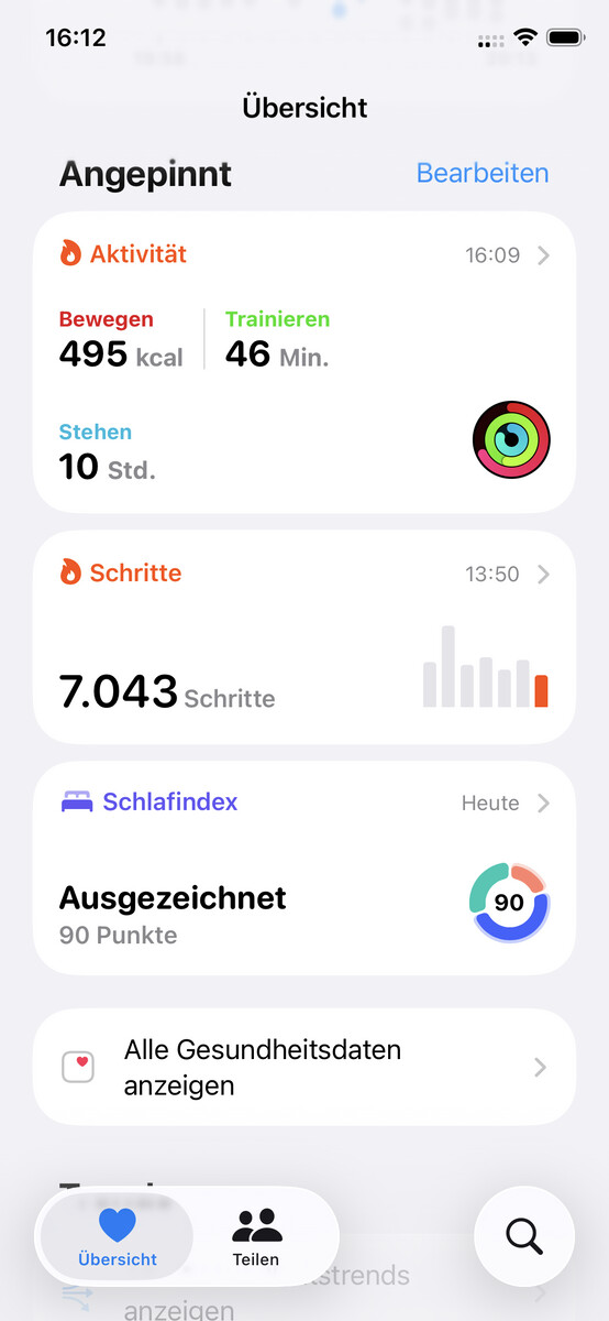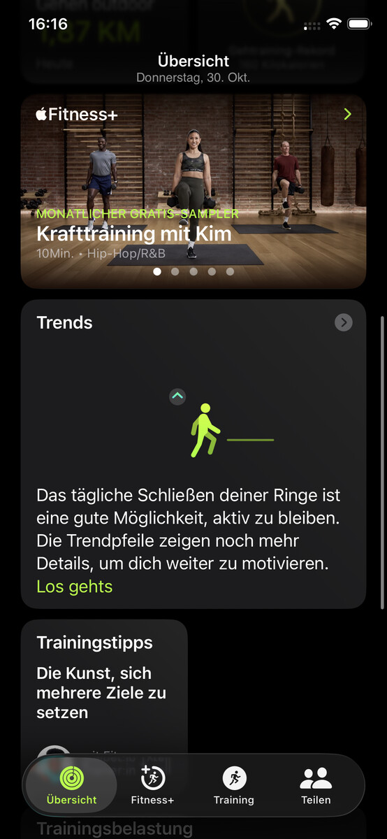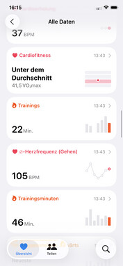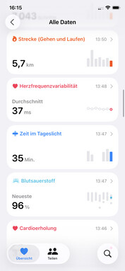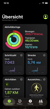 Apple nadal wykorzystuje swoje charakterystyczne pierścienie aktywności do śledzenia codziennego ruchu. Pierścienie reprezentują kalorie spalone podczas ćwiczeń, minuty aktywnego treningu i godziny spędzone w pozycji stojącej. Oprogramowanie wyświetla również dodatkowe dane, takie jak wykonane kroki, pokonany dystans i pokonane piętra - wszystko starannie uporządkowane na osi czasu. Użytkownicy mogą nawet przeglądać długoterminowe trendy dla każdej kategorii.