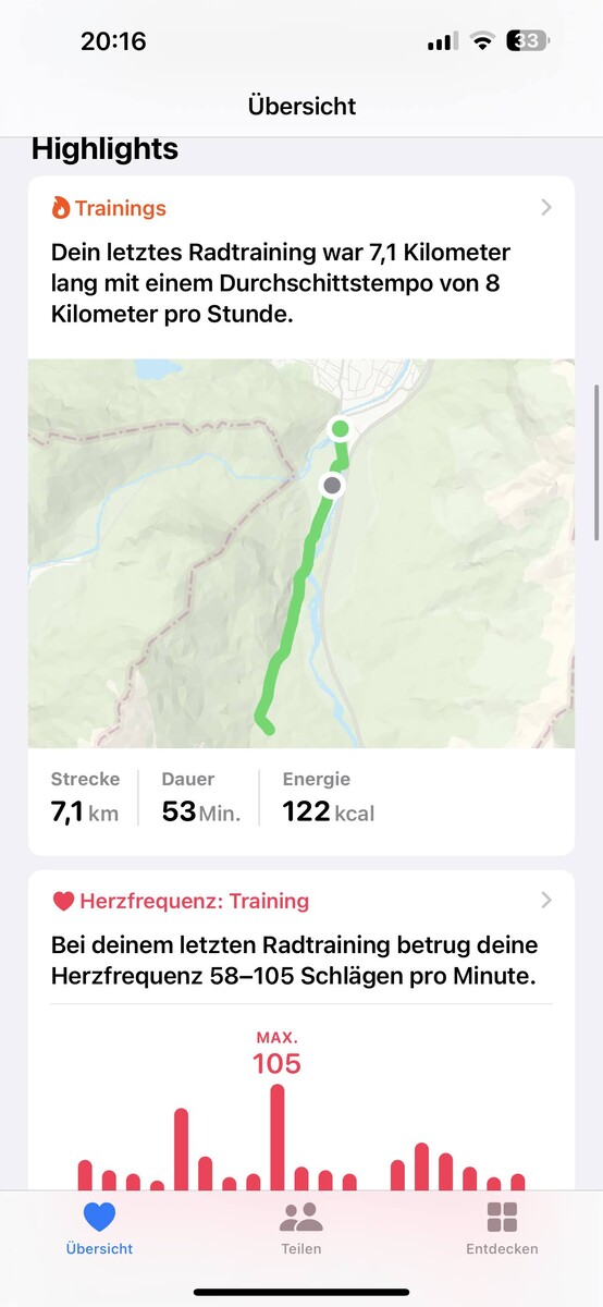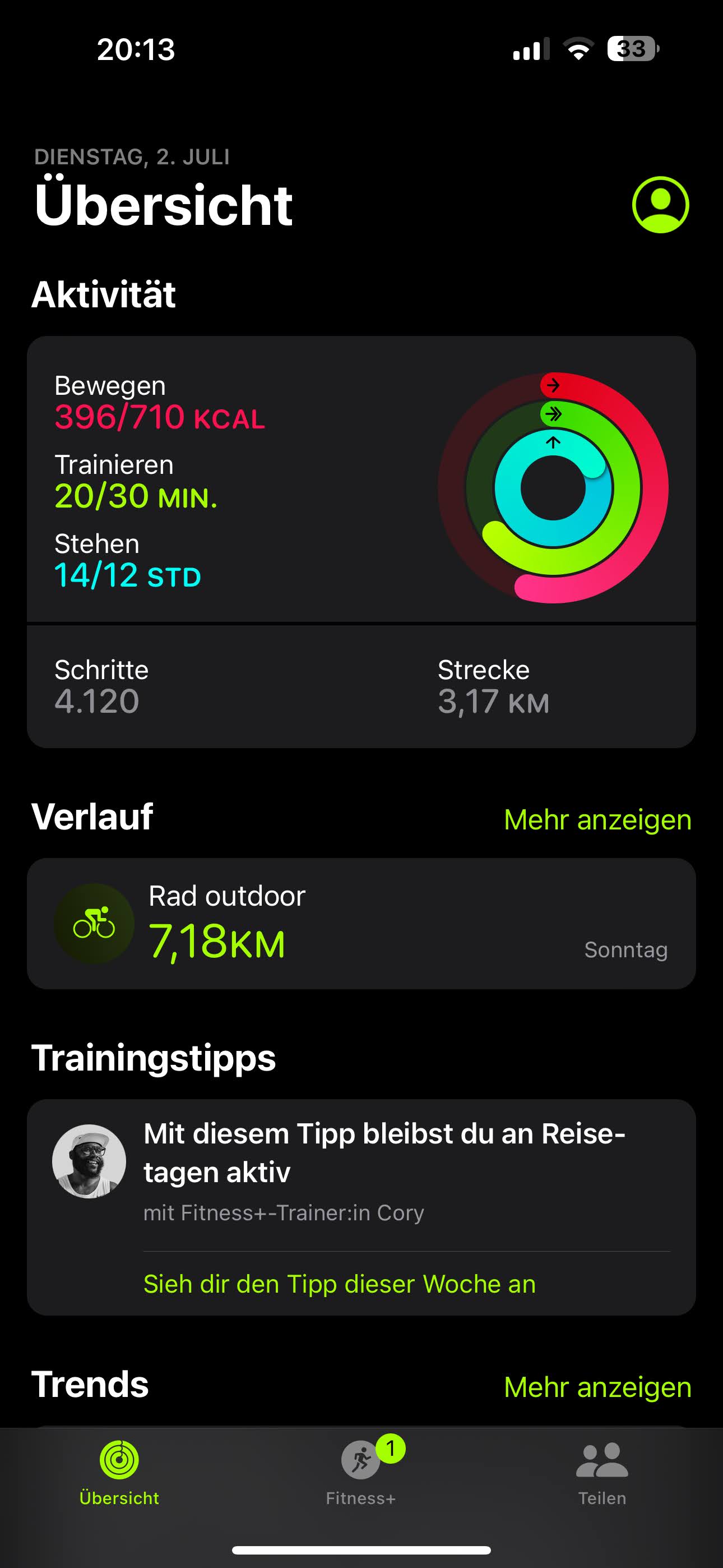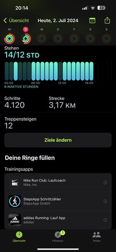 Trendy można wyświetlić w aplikacji Zdrowie po krótkim czasie. Oprogramowanie oblicza średnią minut treningu w tygodniu lub porównuje wartości dzienne ze średnią dla danej pory dnia.