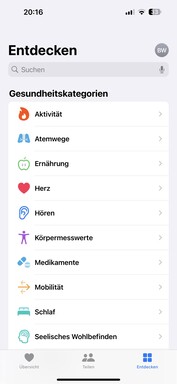 Inne nietypowe dane obejmują czas w świetle dziennym, pomiar asymetrycznego chodu, stabilność chodu i prędkość wchodzenia po schodach. Aplikacja mindfulness może być również używana do rejestrowania nastrojów i refleksji nad myślami. Za pośrednictwem aplikacji dostępne są również ćwiczenia oddechowe.