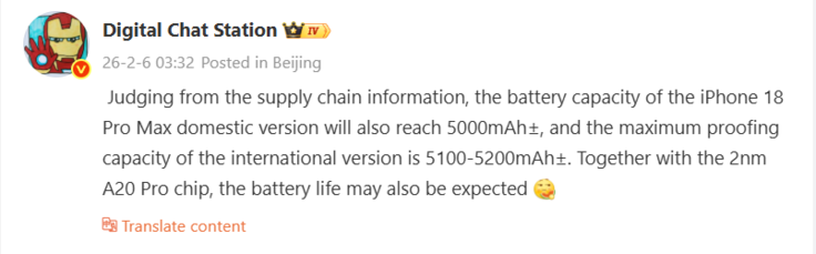 W oparciu o informacje z łańcucha dostaw, chiński leaker Digital Chat Station właśnie ujawnił, po raz pierwszy, dość konkretne szczegóły dotyczące planowanych rozmiarów baterii, które Apple planuje dla iPhone'a 18 Pro Max, spodziewanego jeszcze w tym roku. W związku z tym ponownie pojawią się dwa różne modele iPhone'a 18 Pro Max: model tylko z eSIM o pojemności baterii od około 5100 mAh do 5200 mAh oraz klasyczny model z gniazdami nano-SIM, który pomieści baterię o pojemności 5000 mAh.