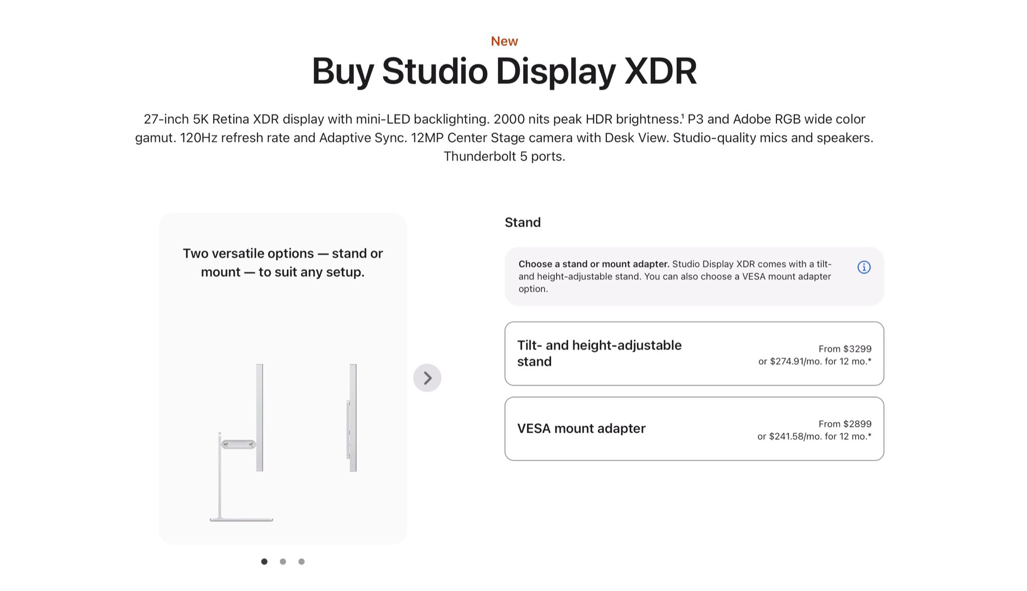 Teraz to się zmienia, ponieważ podczas gdy wersja ze stojakiem jest nadal dostępna za 3 299 USD, Apple obniża cenę katalogową wersji z adapterem VESA do 2 899 USD - co oznacza zniżkę w wysokości 400 USD. Za niskorefleksyjne szkło z nanoteksturą, Apple nadal pobiera dodatkowe 300 USD
