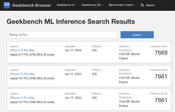 Jak dotąd, strona Apple publicznie udostępniła jedynie wczesne wersje beta systemu iOS 18. Niemniej jednak, lepsza wydajność NPU jest już widoczna w syntetycznych testach porównawczych, takich jak Geekbench ML. Na przykład, iPhone 15 Pro Max zazwyczaj uzyskuje nieco ponad 5500 punktów w Geekbench ML 0.6.0 w iOS 17.5.1. Dla porównania, wynik ten wzrasta o około 2000 punktów do ponad 7500 punktów na iOS 18, co stanowi poprawę o 36%. Apple potwierdził również, że iOS 18 zapewni lepszą wydajność NPU dla A16 Bionic-napędzanych przez A16 Bionic. Jednak jego 17 TOPS NPU oznacza, że Apple Intelligence będzie ograniczone do iPhone'a 15 Pro i iPhone'a 15 Pro Max, a także ich następców.