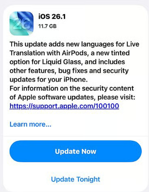 Po wydaniu iOS 26 we wrześniu wraz z premierą iPhone'a 17, pierwsza duża aktualizacja dla obecnego systemu operacyjnego iPhone'a jest już dostępna. Patch o wadze około 4,6 GB wprowadza między innymi możliwość zmniejszenia przezroczystości i przyciemnienia Apple"Liquid Glass" w celu poprawy czytelności tekstu.
