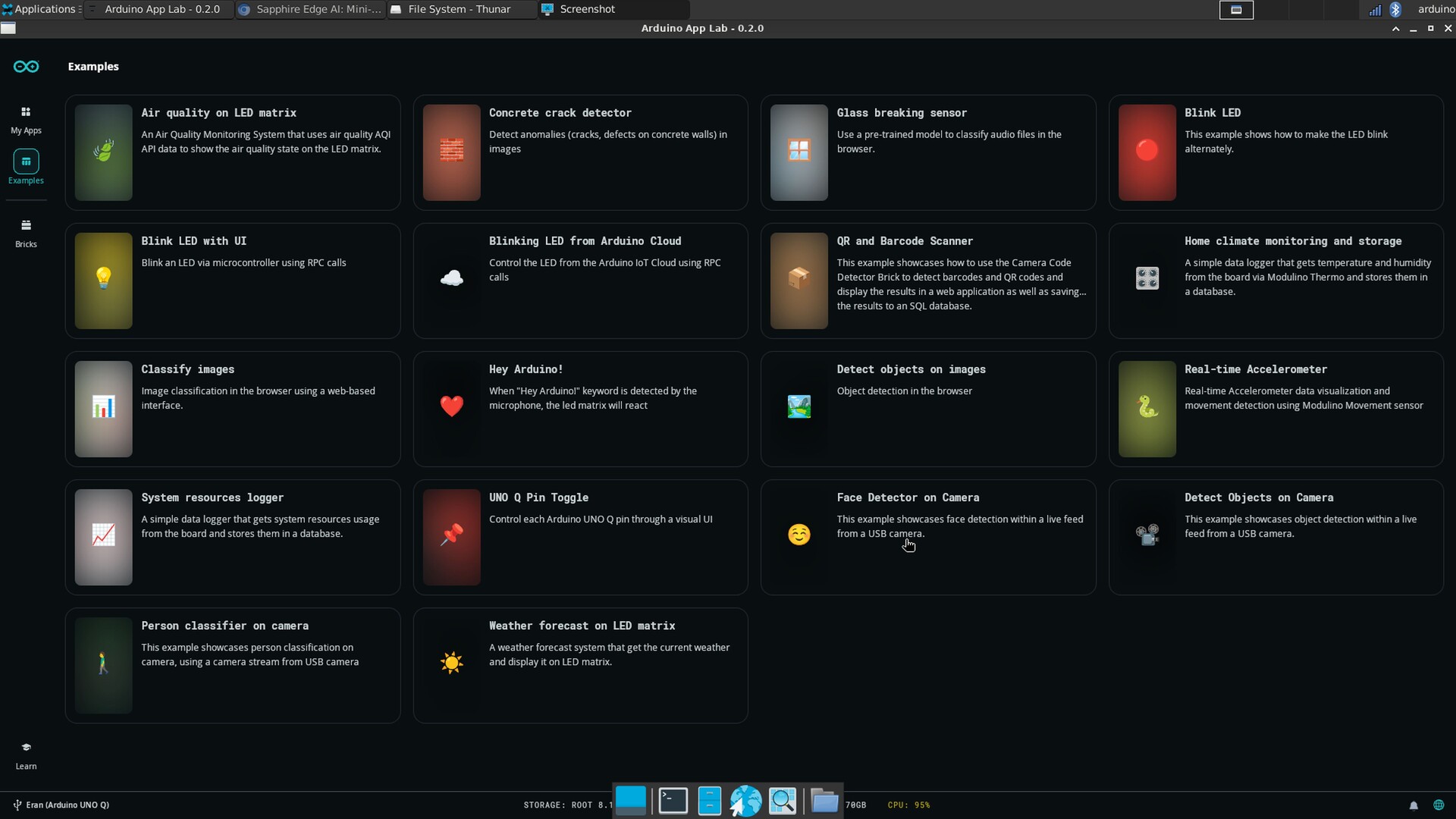 Arduino App Lab jest preinstalowany i aktualizuje się przez Wi-Fi po wstępnej konfiguracji. Umożliwia on tworzenie aplikacji wykorzystujących zarówno SoC Qualcomm, jak i wbudowany MCU. Dołączone przykłady dobrze to ilustrują: płyta oferuje stosunkowo dużą moc obliczeniową jak na platformę deweloperską, umożliwiając lokalne obciążenia AI. Obsługiwane są wstępnie wytrenowane modele do zadań takich jak rozpoznawanie obrazu, co rozszerza możliwości tradycyjnej płyty deweloperskiej o aplikacje oparte na sieciach neuronowych.