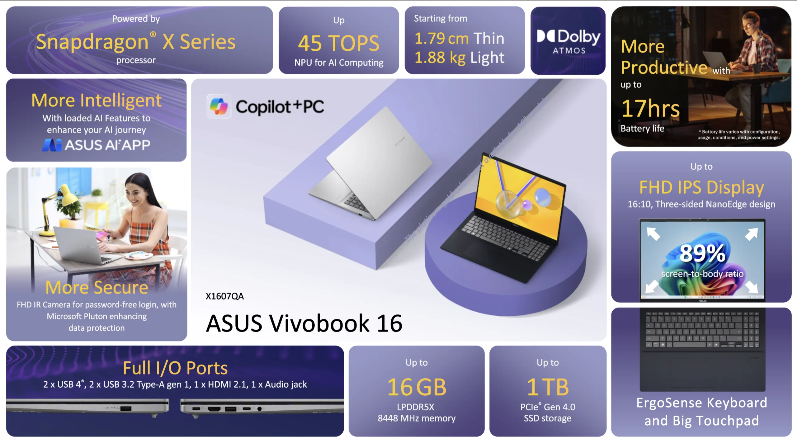 Co więcej, Asus twierdzi również, że laptop jest wyposażony w wojskową wytrzymałość i żywotność baterii do 17 godzin. Inne funkcje obejmują kamerę Full-HD IR, głośniki dostrojone do Dolby Atmos, funkcje AI i do 50 TOPS NPU, co powinno skutkować przyzwoitą wydajnością w obciążeniach AI.