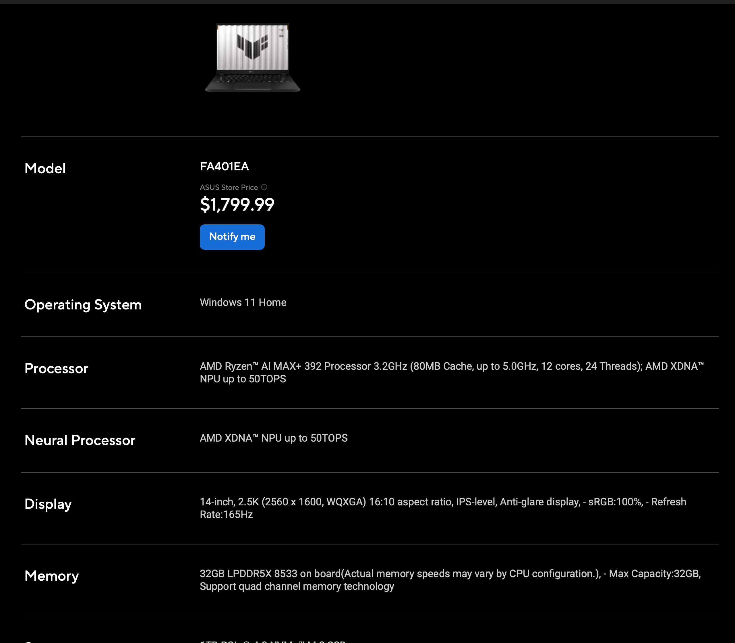 W zeszłym tygodniu, Asus wypuścił swój pierwszy gamingowy laptop AMD Strix Halo na wielu rynkach. Sprzedawany jako TUF Gaming A14 (FA401EA), laptop jest obecnie jedynym urządzeniem wyposażonym w procesor AMD Ryzen AI Max+ 392 APU. Chociaż jest to opcja niższego poziomu w porównaniu z Ryzen AI Max+ 395 wewnątrz ROG Flow Z13 (obecnie 2 169 USD na Amazon), ten nowy APU powinien zapewnić podobną wydajność graficzną dzięki identycznemu Radeon 8060S iGPU.