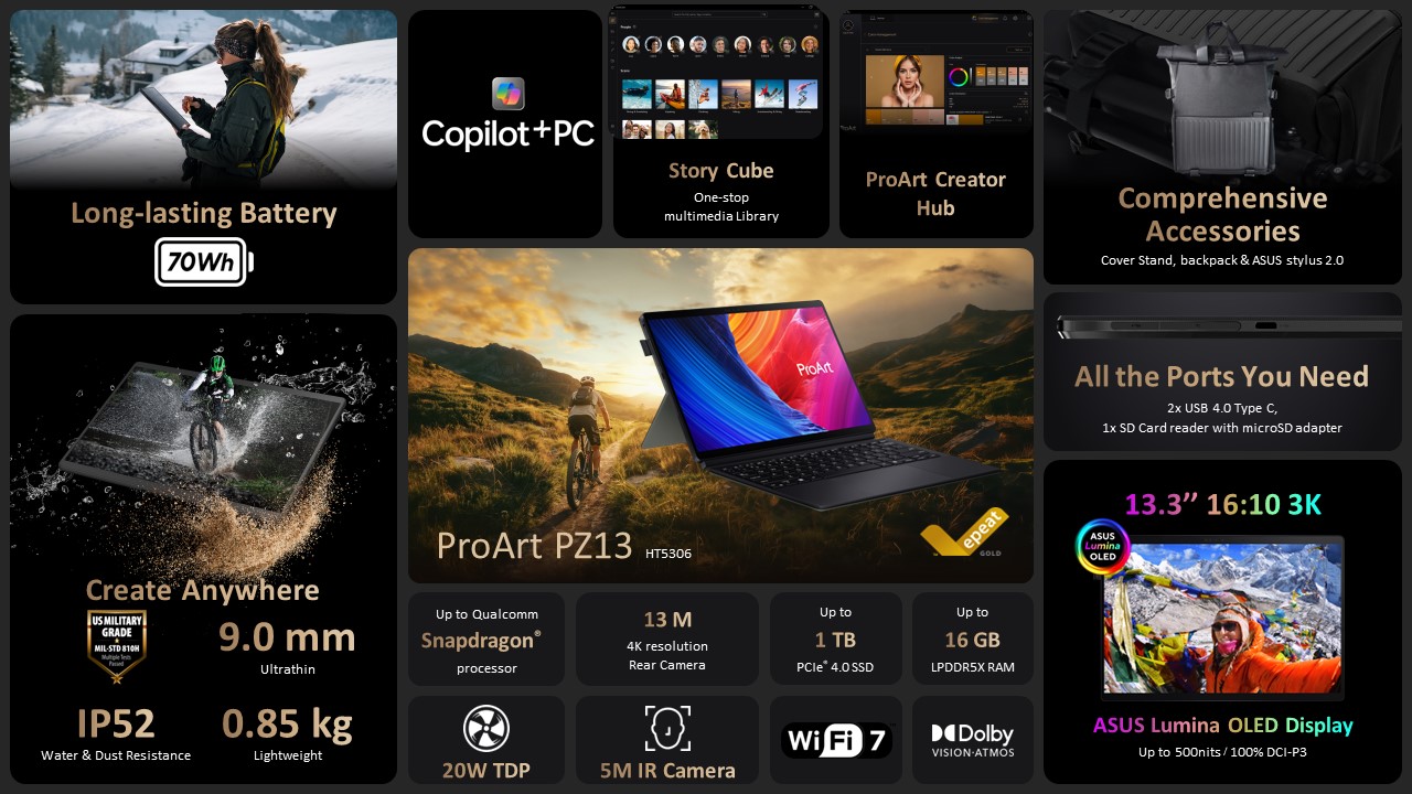 Podobnie jak PX13, PZ13 posiada 13-calowy panel dotykowy 3K Asus Lumina OLED ze 100% pokryciem DCI-P3 i jasnością 500 nitów. Asus nie wspomina dokładnie o zastosowanym SKU Snapdragona, ale określa całkowite TDP na 20 W. Urządzenie można skonfigurować z maksymalnie 16 GB LPDDR5X RAM i do 1 TB PCIe Gen 4 SSD.