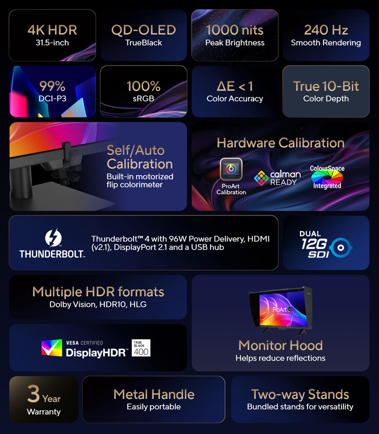 W szczególności wprowadziła na rynek ProArt Display OLED PA32USD z natywną rozdzielczością 4K (3 840 x 2 160). PA32USD zapewnia również częstotliwość odświeżania 240 Hz i czas reakcji 0,1 ms GtG, w przeciwieństwie do wielu profesjonalnych monitorów. Asus wspomina o szczytowych wartościach jasności 250 nitów SDR i 1000 nitów HDR, które są zgodne z innymi niedawnymi 32-calowymi monitorami QD-OLED.