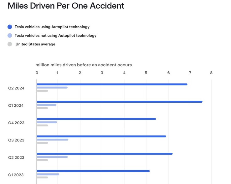Tesla twierdzi, że imponująco niski wskaźnik wypadków Autopilota w drugim kwartale 2024 r. pokazuje, że jej pojazdy elektryczne przejechały blisko 7 milionów mil z włączonym Autopilotem bez żadnego wypadku. Przy wyłączonym Autopilocie wskaźnik wypadków był znacznie wyższy i wynosił około 1,5 miliona mil przejechanych przed pojedynczym wypadkiem. Dla porównania, średnia krajowa w USA w tym obszarze wynosi mniej niż 1 milion mil.