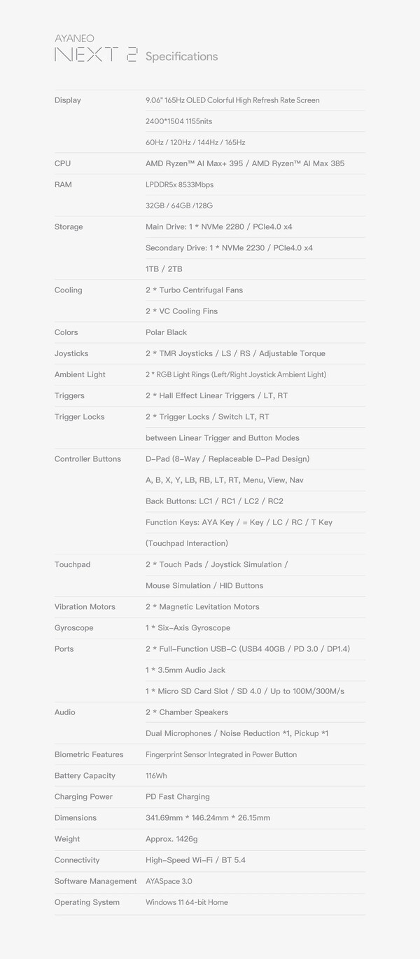 Konkretnie, Ayaneo oferuje Next 2 z jednym z następujących układów Ryzen AI Max 385 lub Ryzen AI Max+ 395podobnie jak OneXPlayer Apex i GPD Win 5(obecnie 2 399,99 USD na Amazon). Next 2 różni się od swoich rówieśników 9,06-calowym wyświetlaczem OLED i zewnętrzną baterią o pojemności 116 Wh. W sumie Next 2 waży 341,69 x 146,24 x 26,15 mm i waży około 1,43 kg. Proszę zapoznać się z poniższym arkuszem specyfikacji, aby uzyskać pełne dane techniczne.