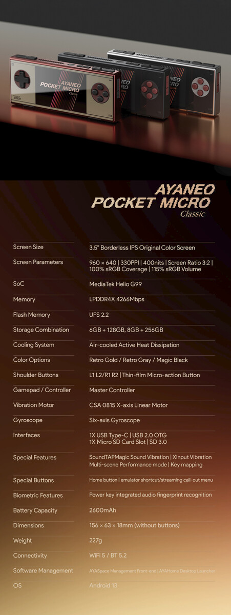 Na przykład, Ayaneo nadal zawiera procesor MediaTek Helio G99 wspierany przez baterię o pojemności 2600 mAh, pamięć RAM LPDDR4X-4266 i pamięć flash UFS 2.2. Pocket Classic oferuje również 3,5-calowy wyświetlacz IPS Micro, który wyświetla obraz w rozdzielczości 960 x 640 pikseli z gęstością pikseli 330 PPI, jasnością szczytową 400 nitów i proporcjami 3: 2. Podobnie, Pocket Classic działa pod Android 13 z preinstalowanymi AYASpace i AYAHome.