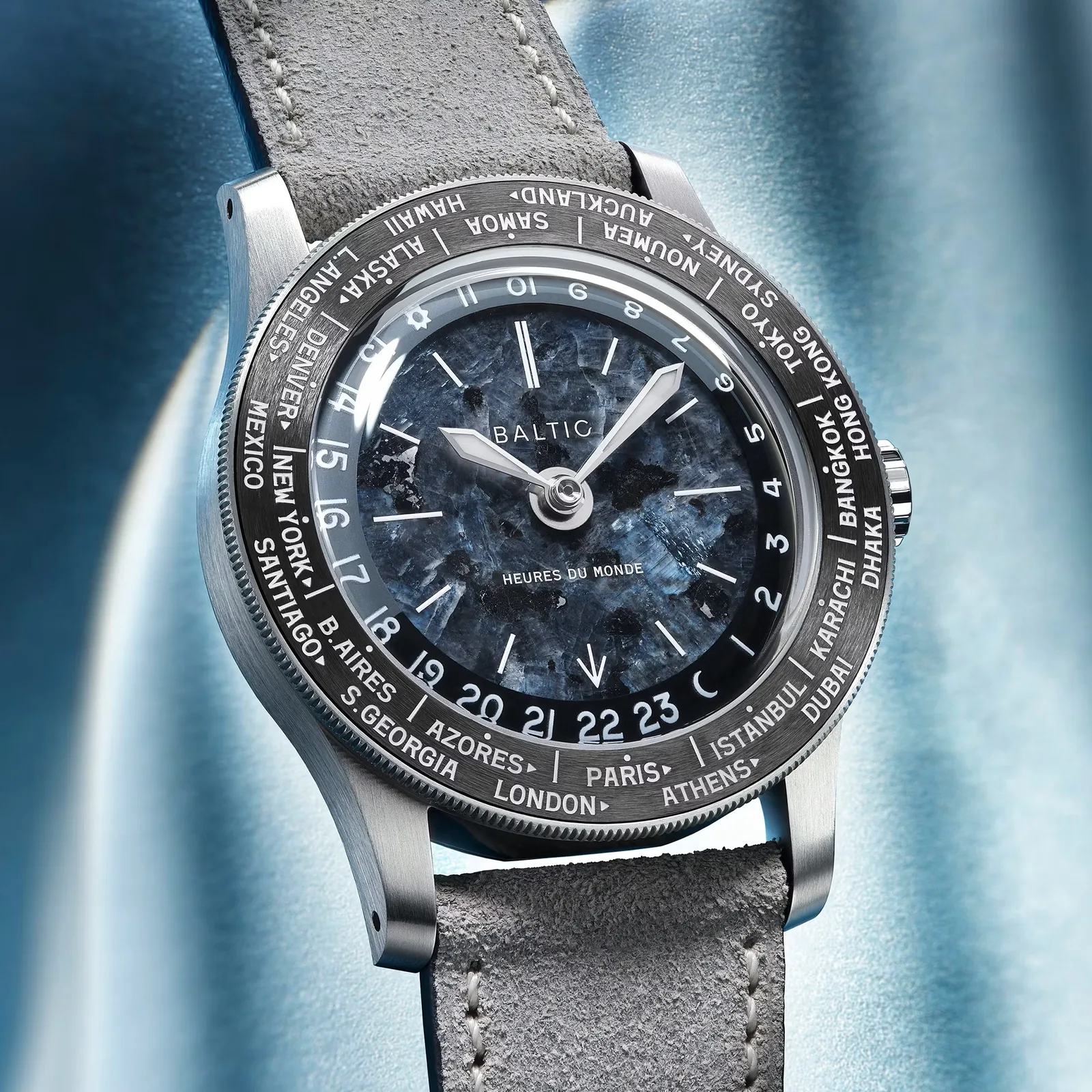 Baltic, francuska mikromarka znana z zegarków mechanicznych neo-vintage zegarków mechanicznychoficjalnie zaprezentowała swój najnowszy zegarek Heures du Monde w stylu vintage. Zegarek posiada kopertę ze stali nierdzewnej o wymiarach 37 mm na 11,3 mm, uzupełnioną 120-klikowym bezelem, który można obracać w celu dopasowania do odpowiedniej strefy czasowej dla funkcji czasu światowego. Na bezelu znajdują się w sumie 24 główne miasta, które są pokryte powłoką Super-LumiNova BGW9.