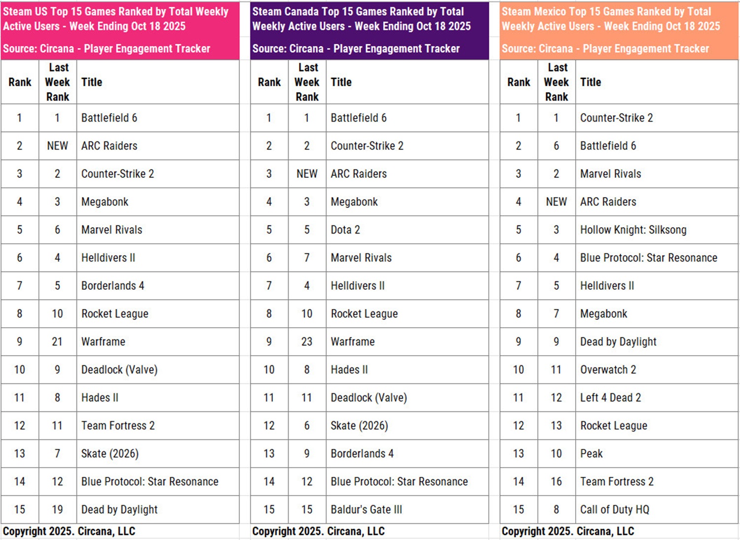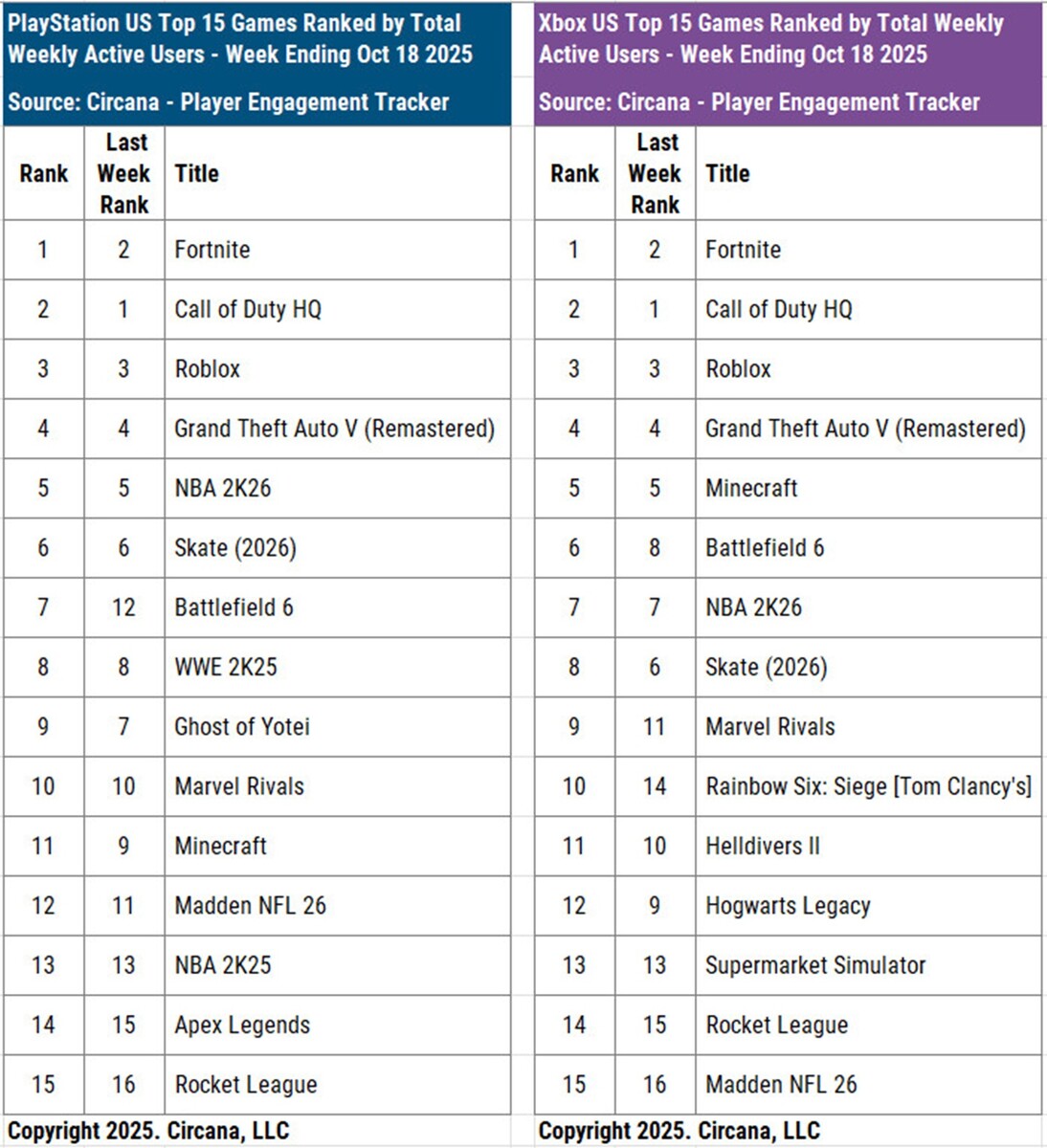 Mat Piscatella udostępnił dane Circana na Blueskypokazującymi zaangażowanie graczy na konsolach PlayStation i Xbox. Statystyki obejmują tydzień kończący się 18 października, w tym pierwsze dni po dacie premiery Battlefield 6. Mierząc całkowitą liczbę aktywnych użytkowników w Stanach Zjednoczonych, statystyki Call of Duty HQ zajmuje drugie miejsce za Fortnite. Tymczasem nowa strzelanka Dice zajmuje siódme miejsce na PlayStation i szóste na konsolach Xbox.