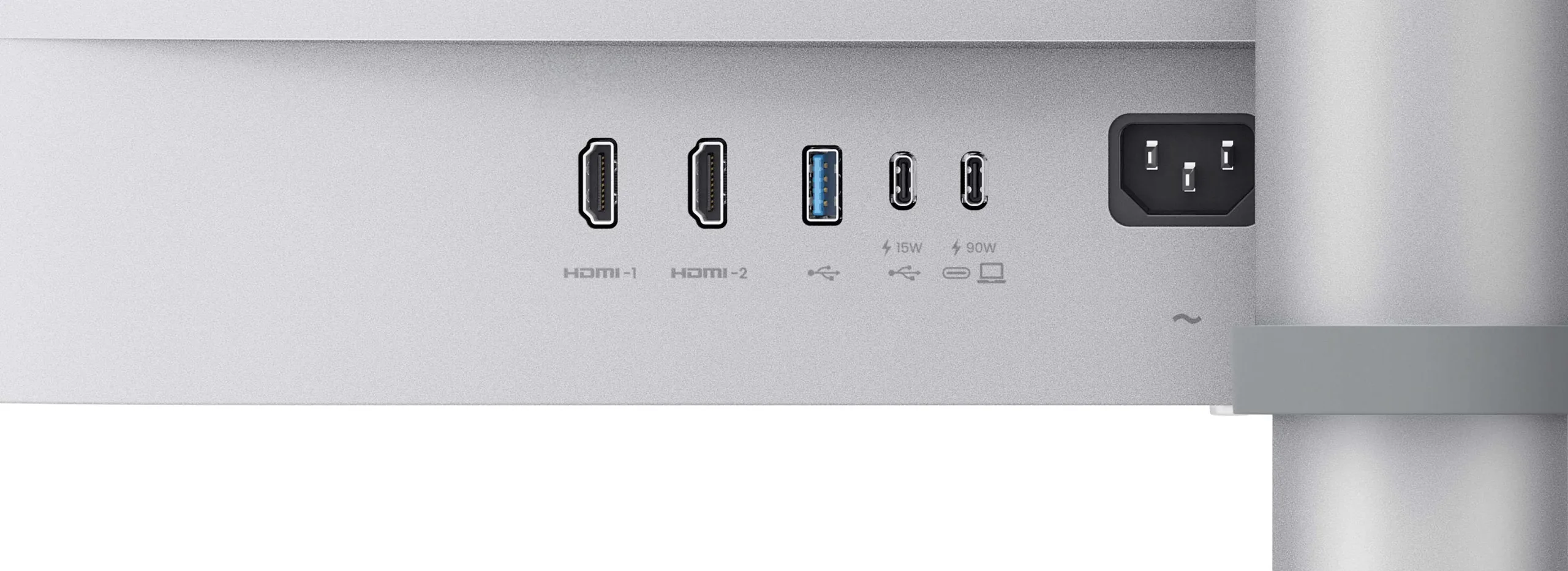 Dostępne są ergonomiczne funkcje, w tym regulacja wysokości, regulacja nachylenia i obrót o 90 stopni w trybie portretowym (pivot). Na pokładzie znajduje się port USB-C, umożliwiający zasilanie kompatybilnych urządzeń przez USB PD z mocą do 90 watów. Dostępne są również złącza HDMI i DisplayPort, a także dodatkowe porty USB do podłączania urządzeń peryferyjnych, takich jak mysz i klawiatura