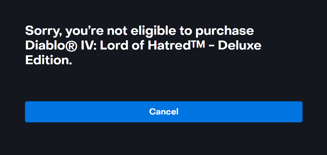 Wielu użytkowników (w tym ja) na Reddit, Battle.net, Xi praktycznie na wszystkich platformach nie jest w stanie kupić rozszerzenia. Początkowo użytkownicy byli witani komunikatem "Przepraszamy, nie kwalifikujesz się do zakupu Diablo IV: Lord of Hatred - Deluxe Edition" w kliencie Battle.net. Klient zmieniał nawet losowo waluty w międzyczasie. W chwili pisania tego tekstu sytuacja nie wydaje się być lepsza.