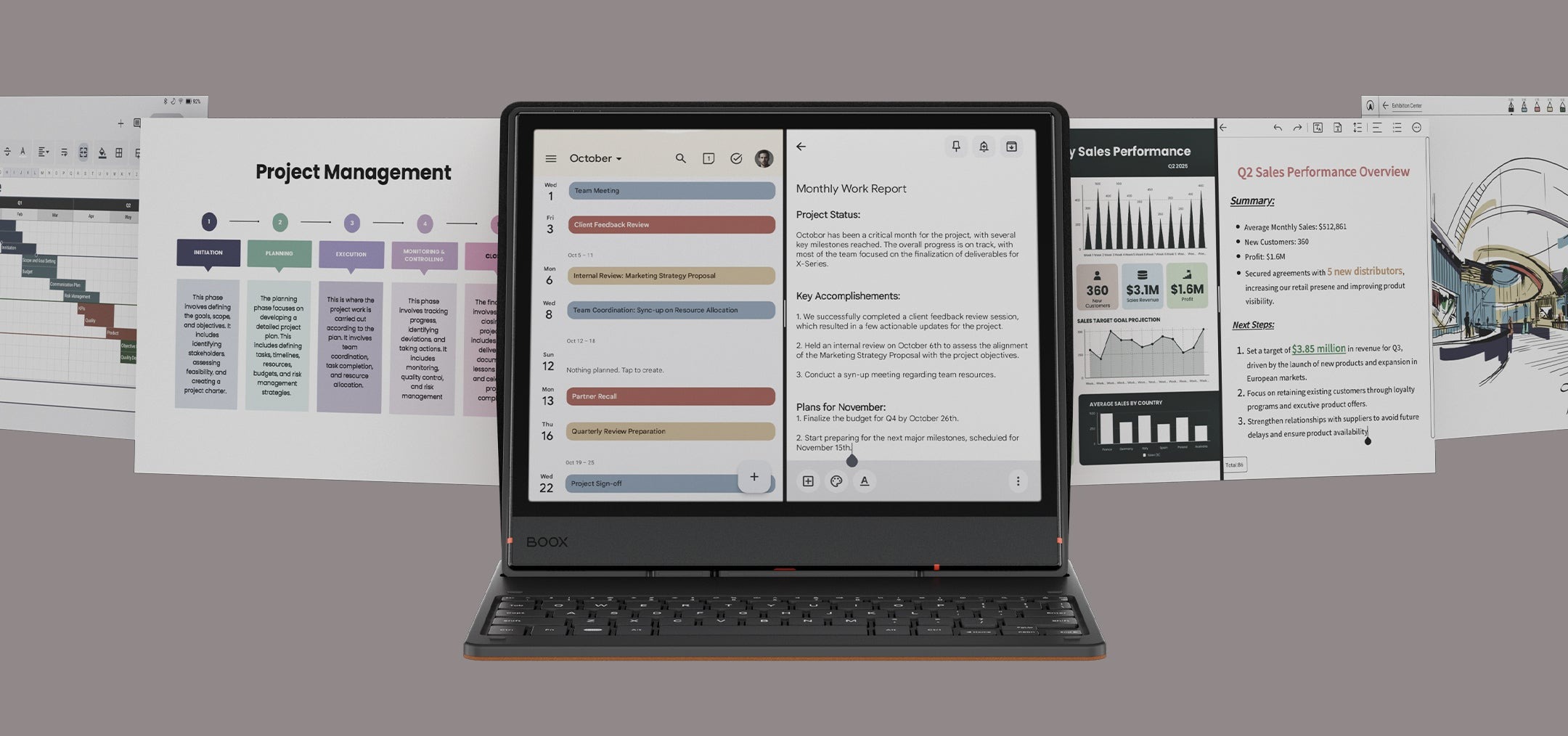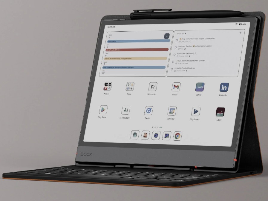 Boox dostarcza go z rysikiem z pięcioma dodatkowymi wkładami i ochronnym etui magnetycznym, które może być używane w orientacji pionowej lub poziomej. Jeśli zdecydują się Państwo na zestaw z klawiaturą, otrzymają Państwo rabat w wysokości ~33 USD/33 EUR i zapłacą 606,99 USD/606,99 EUR zamiast 639,98 USD/ 639,98 EUR.