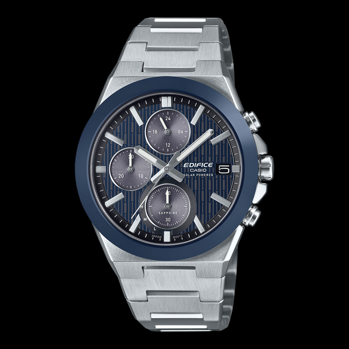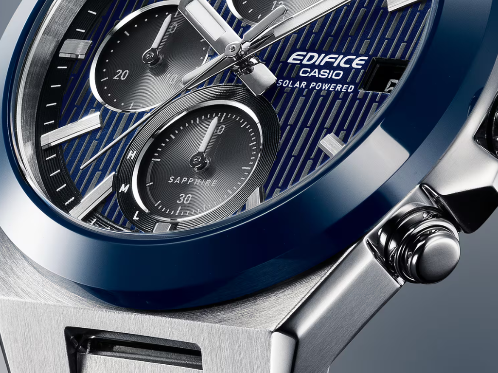 Model EFSS650D-2A wyposażony jest w ceramiczny bezel z niebieską powłoką jonową, otoczony płaską kopertą i bransoletą ze stali nierdzewnej, z lustrzanymi i włosowymi wykończeniami. Sam ceramiczny pierścień jest bardziej odporny na zarysowania niż stal nierdzewna, a jednocześnie nadaje ramce zegarka głęboki, bogaty odcień.