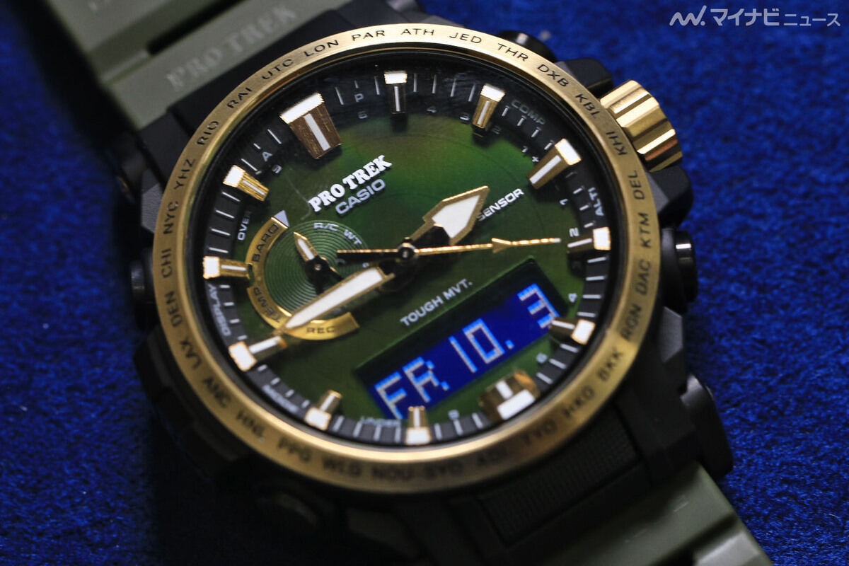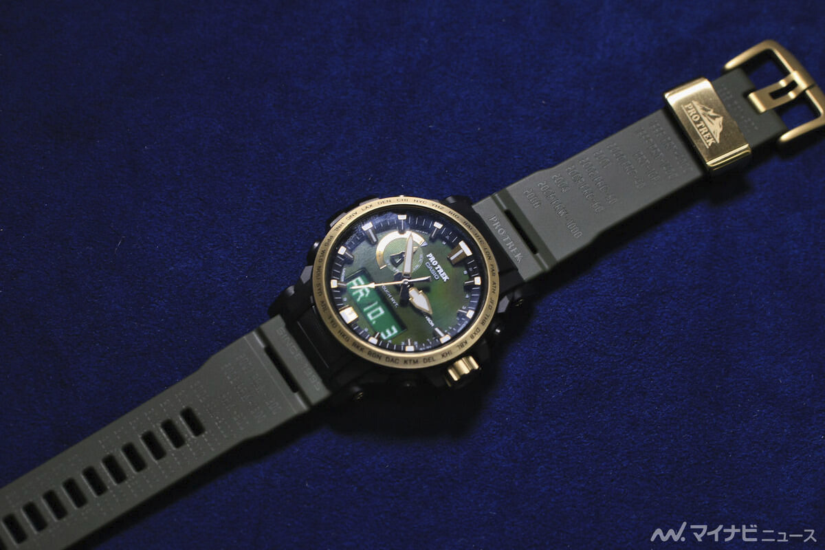 Model PRW-61ANS-3, przy bliższym oświetleniu, ujawnia bogatą oliwkowo-zieloną tarczę z dużą głębią. Złote, naparowane indeksy i wskazówki łapią światło z połyskiem, co z kolei sprawia, że elementy analogowe wyskakują, nie wydając się zbyt odblaskowe. Nawet cyfrowa subtarcza jest teraz czystsza. Jest on wyraźniej osadzony w dolnej części tarczy. Łatwiej jest również dostrzec radialną teksturę pod logo Pro Trek.