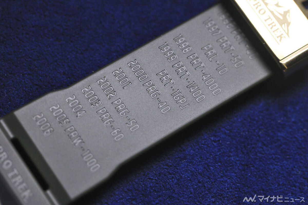 To, co naprawdę wyróżnia się w tej nowej partii zdjęć, to obróbka paska. Bliższe spojrzenie na formowaną żywicę ujawnia ostrzejsze oznaczenia lat na osi czasu Pro Trek, od najwcześniejszych modeli z lat 90. po kultowe wydania z 2000 roku. Rozmiar czcionki i jakość tłoczenia wydają się być spójne w obu modelach, ale oliwkowy odcień paska PRW-61ANS-3 wydaje się być nieco głębszy w naturalnym świetle - prawdopodobnie ze względu na fakturę materiału. Złota klamra i elementy mocujące są teraz nieco mniej krzykliwe.