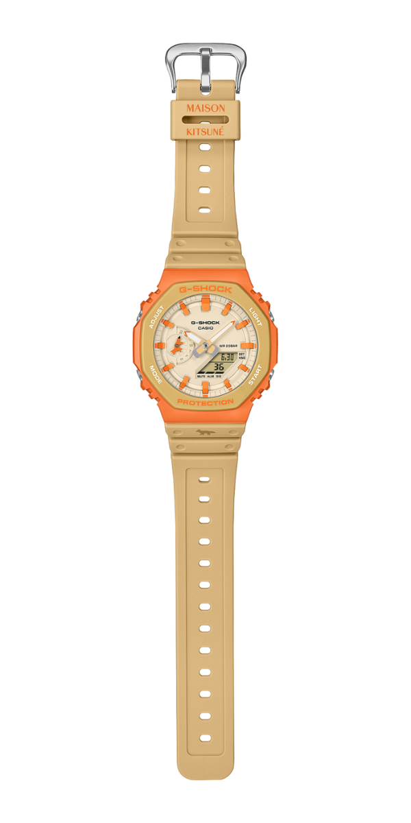 Zegarek Casio G-Shock GA-2110MK-5A ma paletę camaieu lub monochromatyczną, o której mówi się, że jest inspirowana paryską architekturą Haussmanna. Projekt koncentruje się wokół motywu lisa Maison Kitsuné, który można znaleźć na tarczy dnia tygodnia. Bezel zegarka i różne akcenty na jaśniejszej tarczy są w pasującym jasnopomarańczowym kolorze. Wykonany z żywicy zegarek mierzy 48,5 x 45,4 x 11,8 mm (~1,91 x 1,79 x 0,46 cala), z efektownym pomarańczowym bezelem, a na pasku znajduje się logo Maison Kitsuné.