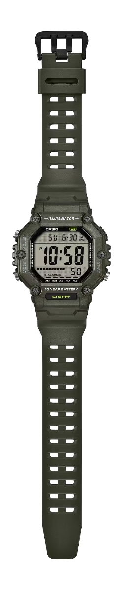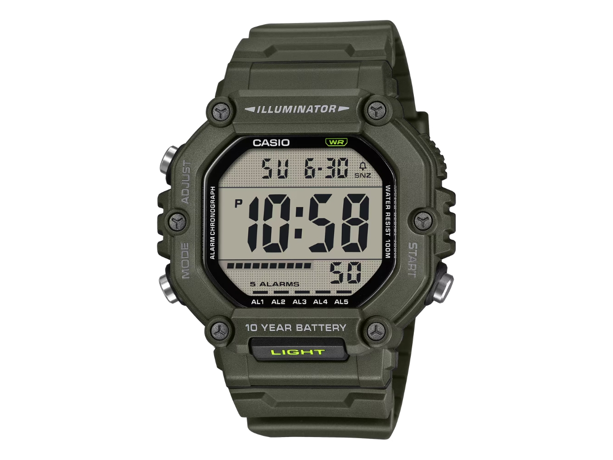 Casio AE-1600 to zegarek z podwójnym pomiarem czasu, wyposażony w takie narzędzia jak stoper, minutnik i pięć dziennych alarmów. Cyfrowy wyświetlacz może być podświetlony bursztynowym podświetleniem LED po naciśnięciu przycisku. Inne godne uwagi funkcje obejmują wodoodporność 100 m i dłuższą 10-letnią żywotność baterii CR2032.