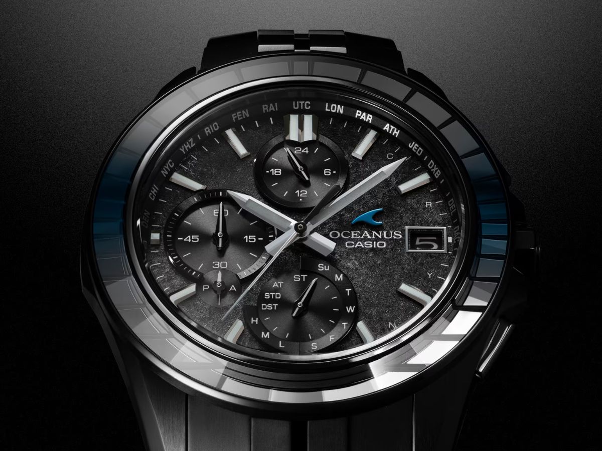 Casio Oceanus Manta OCWS7000CN1A to czarny zegarek z matową teksturowaną tarczą i ręcznie wycinanym szafirowym szkłem, które świeci na niebiesko, gdy łapie światło. Obudowa i pasek z trzykrotnym zapięciem wykonane są z tytanu, a model ten sprzedawany jest jako wodoodporny do 100 m.