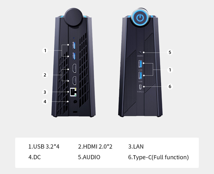 Nowe wersje AM08 posiadają te same opcje rozszerzeń i porty, co wcześniejsze edycje, z dwoma gniazdami SO-DIMM dla pamięci RAM DDR5-4800, gniazdem M.2 2280 i 2,5-calową kieszenią na dysk. Co więcej, mini-PC posiada porty HDMI 2.0, USB Type-A, USB Type-C i Gigabit Ethernet, jak pokazuje poniższy obrazek. Odświeżony AM08 zachował również fizyczne pokrętło wydajności, z opcjami dla trybów "Silent", "Auto" i "Performance".
