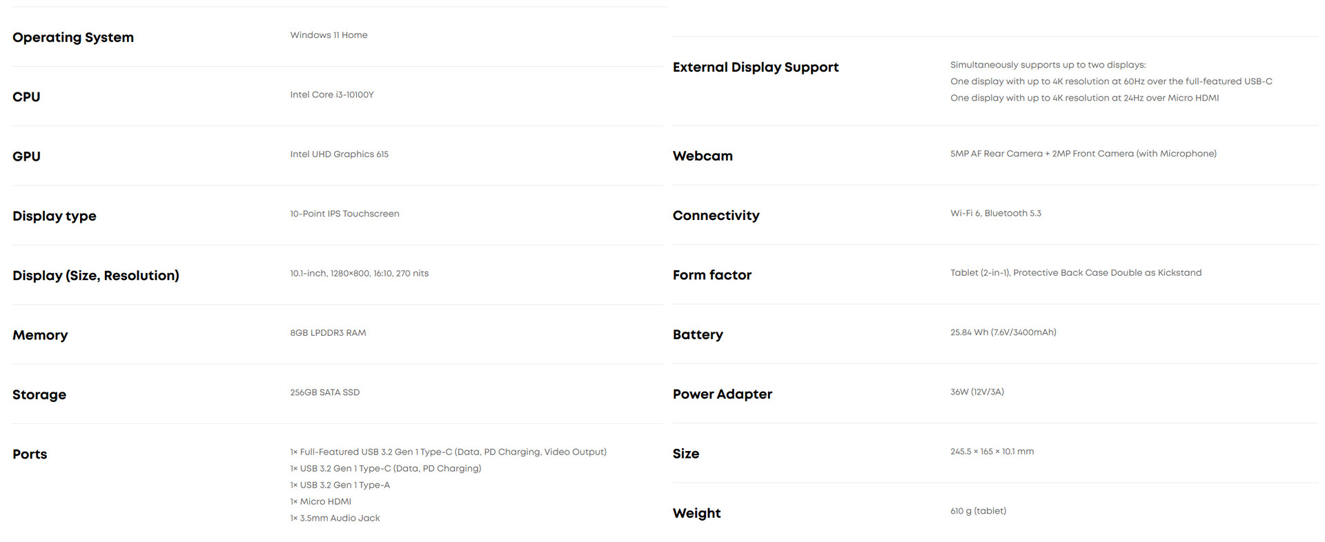 Na spodzie Hi10 X2 znajduje się złącze pogo pin umożliwiające podłączenie klawiatury do tabletu z systemem Windows(dostępne na Amazon). Jeśli chodzi o łączność bezprzewodową, kabriolet posiada WiFi 6 i Bluetooth 5.3. Inne zalety to 8 GB pamięci RAM, 256 GB pamięci masowej oraz stosunkowo lekka i cienka konstrukcja.