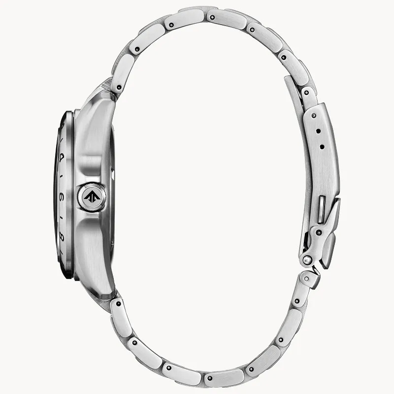 The Citizen Promaster seria Citizen Promaster otrzymuje nowy GMT z tarczą w kolorze burgundu i jest to kolorystyka, która stanowi odejście od tradycyjnych czarnych i niebieskich palet użytkowych powszechnie spotykanych w linii profesjonalnej. Model ten posiada strukturalne DNA serii Endeavor/Land, wyposażony w 44 mm kopertę ze stali nierdzewnej o konstrukcji ukierunkowanej na trwałość. Główną cechą jest możliwość podwójnego czasu, ułatwiona przez dedykowaną wskazówkę GMT z żółtą obwódką i wygrawerowanym, stałym 24-godzinnym zewnętrznym bezelem. W przeciwieństwie do niektórych poprzednich modeli z serii BJ7140, które wykorzystywały wewnętrzne obrotowe pierścienie kompasu, ten konkretny wariant wykorzystuje zamiast tego kontrastowy układ cyfr arabskich i uproszczony bezel.