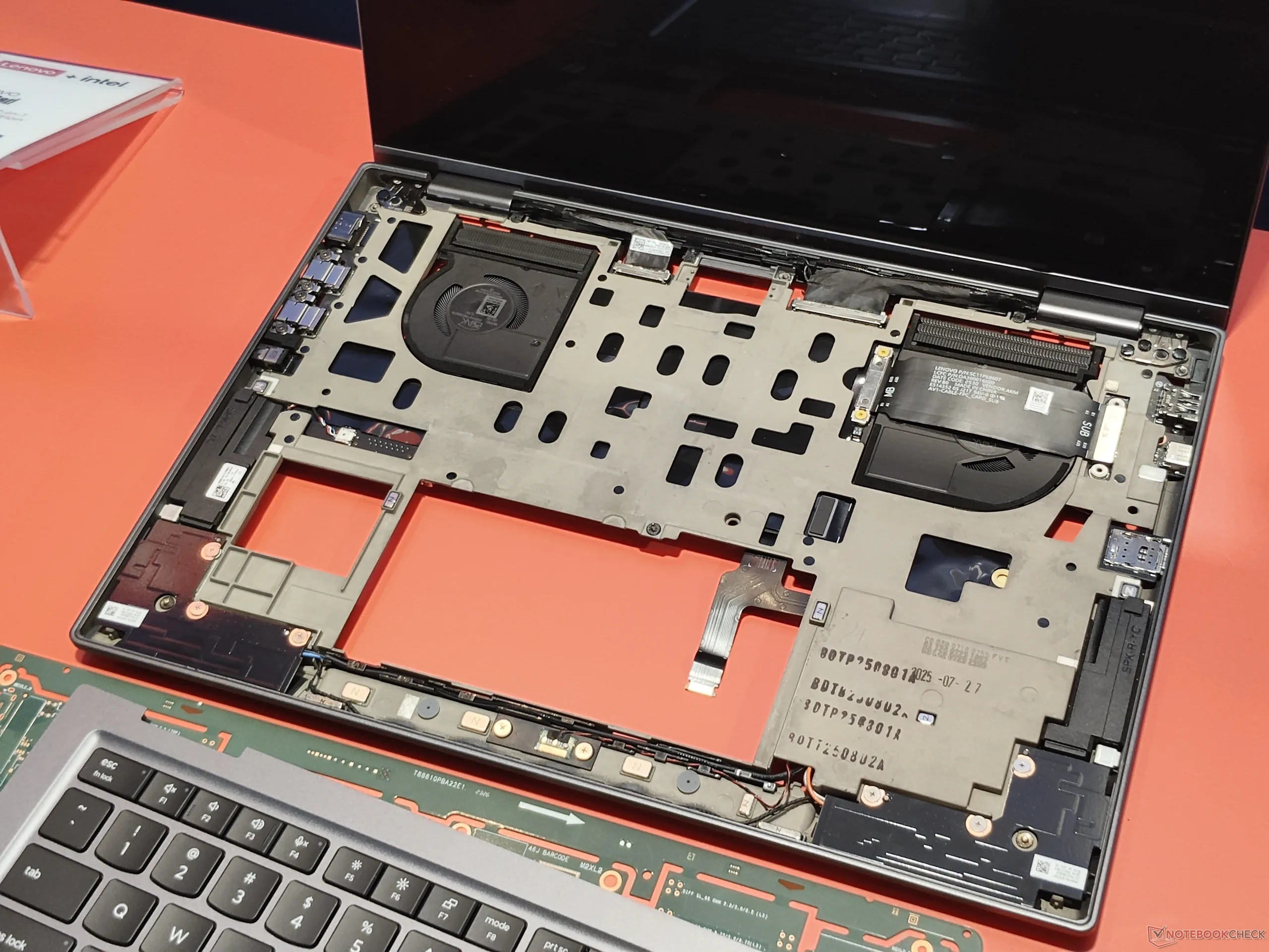 Kolejną korzyścią jest lepsze wykorzystanie dostępnej przestrzeni, stąd "space frame". Umieszczając niektóre komponenty po drugiej stronie nowej środkowej ramki, takie jak złącza wyświetlacza i anteny Wi-Fi, Lenovo było w stanie zwolnić cenną przestrzeń, która została wykorzystana do zwiększenia rozmiaru układu chłodzenia - umożliwiając chłodzenie do 30 W pod pełnym obciążeniem zamiast zaledwie 22,5 W w poprzednim X1 Carbon Gen 13(dostępny na Amazon). Jest to szczególnie przydatne w przypadku nowych procesorów Panther Lake, ponieważ Intel Core Ultra X7 potrzebuje więcej energii, aby działać znacznie lepiej niż poprzednie procesory Lunar Lake. Dodatkowo, dzięki nowej, mniejszej płycie głównej, Lenovo było w stanie uczynić porty USB typu C modularnymi i umieścić niektóre z pozostałych portów na oddzielnej płycie głównej.