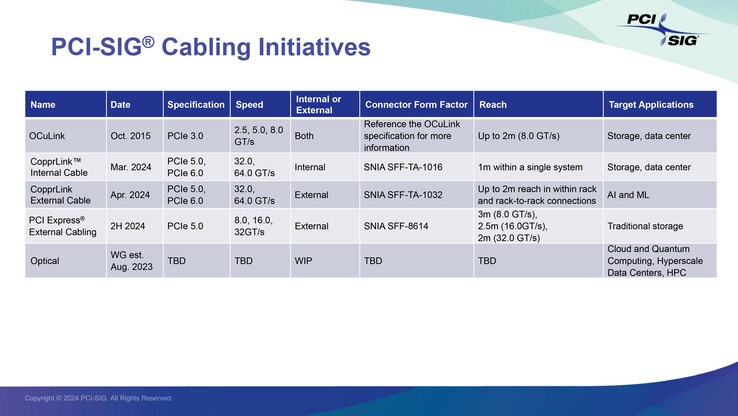 PCI-SIG przyjęło teraz nowy standard. CopprLink powinien być odpowiedni do podłączania zarówno zewnętrznych, jak i wewnętrznych kart rozszerzeń za pośrednictwem PCIe. Istnieją jednak różnice w zależności od rodzaju zastosowania: kable wewnętrzne mogą być używane na odległość do jednego metra, podczas gdy kable zewnętrzne mogą być używane na odległość do dwóch metrów.