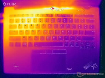 Temperatury powierzchni są zawsze cieplejsze na lewej połowie laptopa niż na prawej ze względu na umiejscowienie rozwiązania chłodzącego i procesora. W rzeczywistości gorący punkt na pokładzie klawiatury może mieć nawet 42 C w porównaniu z zaledwie 20 C na spodzie dłoni. Mimo różnic w wydajności temperatury są jednak porównywalne z X1 Carbon G10 z procesorem Core-P.