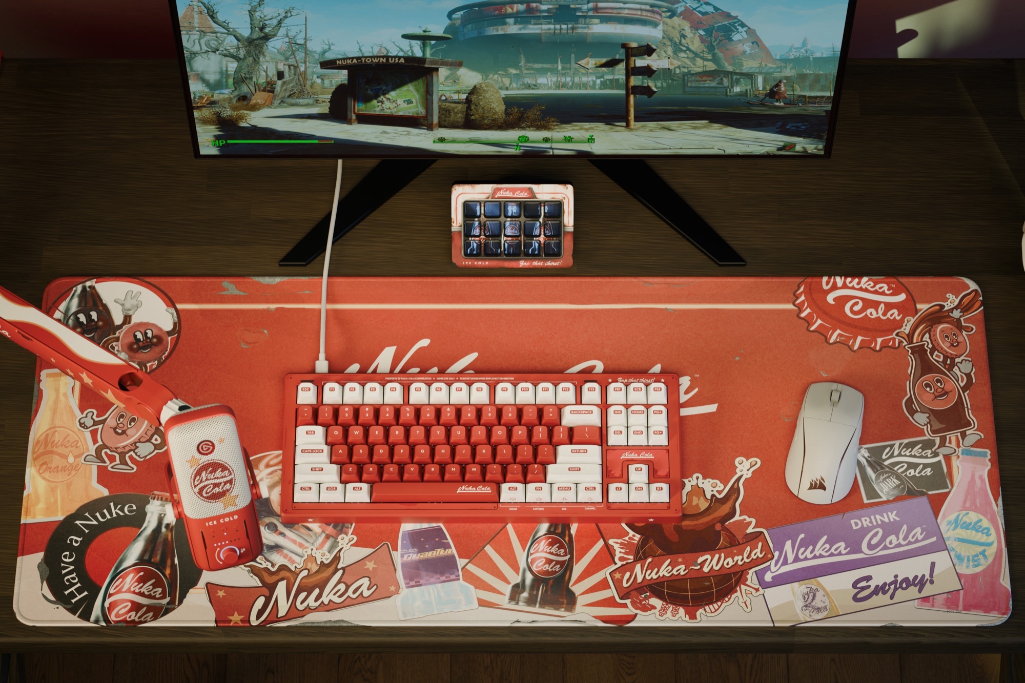 Corsair nawiązał współpracę z Bethesdą, aby wprowadzić na rynek pełną gamę urządzeń peryferyjnych dla graczy inspirowanych kultowym designem Nuka Coli, najpopularniejszego napoju w uniwersum Fallouta. Kolekcja charakteryzuje się retro-futurystyczną estetyką, z czerwono-białą kolorystyką, żółtymi gwiazdami, odważnymi blokami kolorów i stylowym logo Nuka Cola.