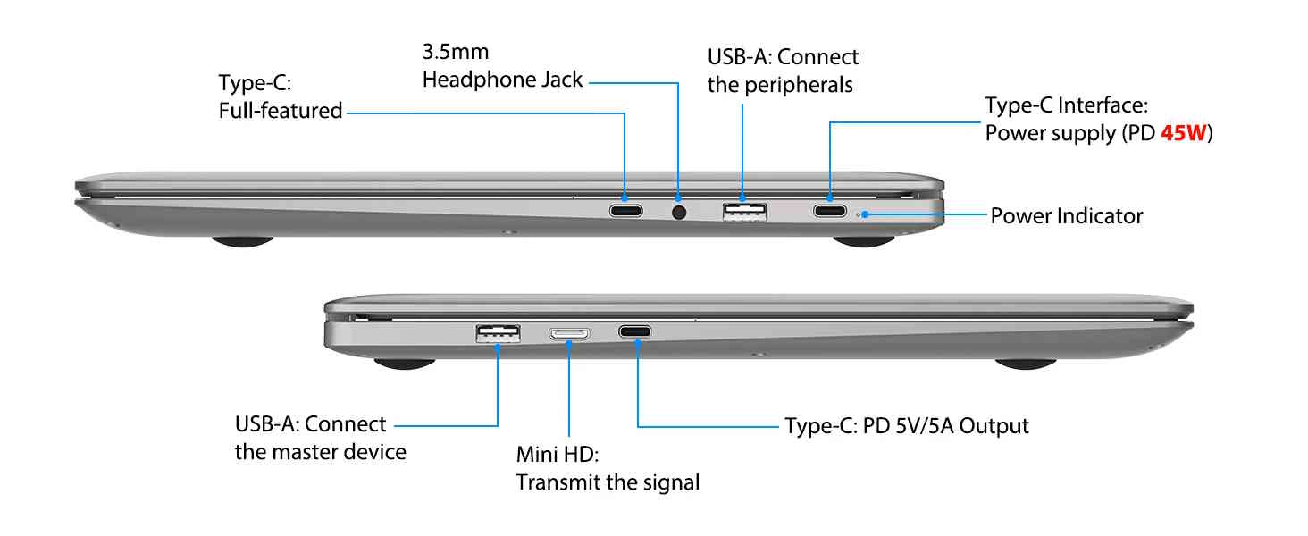 Układ klawiatury to QWERTY, w tym numpad i touchpad. Urządzenie może odbierać zarówno energię elektryczną, jak i sygnały obrazu przez USB-C. Łącznie dostępne są trzy porty USB-C i jeden port mini HDMI. Kolejne porty obejmują dwa porty USB-A, wyjście jack i dwa głośniki. Model waży 1545 gramów i mierzy 372 × 244 × 26 milimetrów. Więcej szczegółów znajdą Państwo na stronie produktu https://www.elecrow.com/crowview-note-15-6-all-in-one-portable-monitor-phone-to-laptop-device.html?idd=6.