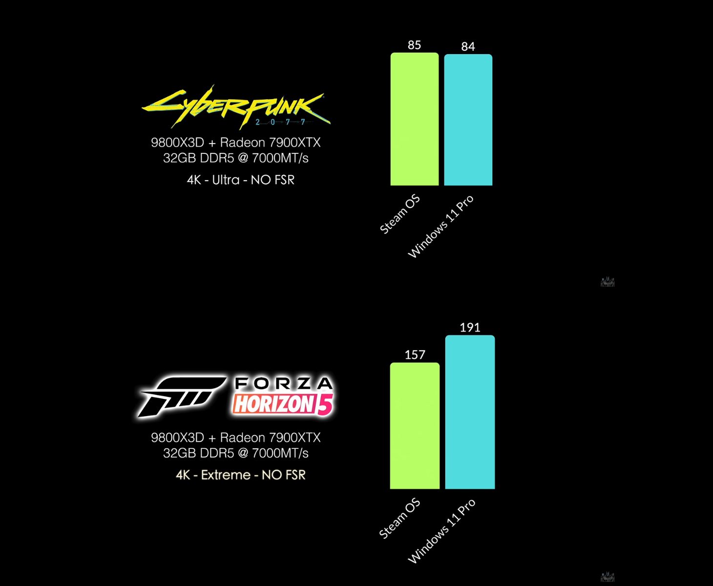 Borderlands 4 wykazał niewielką przewagę systemu Windows 11, ze średnią 74 FPS w porównaniu do 69 FPS systemu SteamOS w rozdzielczości 4K Ultra z włączoną funkcją FSR Quality. Forza Horizon 5 wykazała jedną z większych luk, ze średnią 157 FPS na SteamOS przy ustawieniach 4K Extreme bez FSR, podczas gdy Windows 11 osiągnął 191 FPS. ETA Prime zasugerowała, że różnica może wynikać z bliskich powiązań tytułu z ekosystemem Microsoftu.