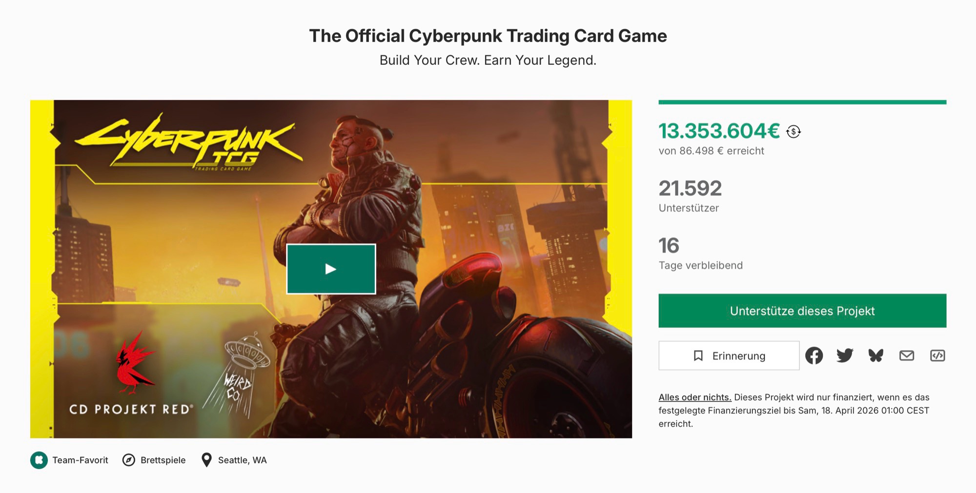Trzy najlepiej sprzedające się gry karciane od lat to Magic: The Gathering, Pokémon i Yu-Gi-Oh! Wieloletni liderzy mają teraz potencjalną konkurencję, ponieważ Kickstarter potwierdził w poście na blogu https://updates.kickstarter.com/cyberpunk-tcg-becomes-the-most-funded-game-in-crowdfunding-history/ że Cyberpunk TCG jest najbardziej udaną grą stołową, jaką kiedykolwiek sfinansowano na Kickstarterze.