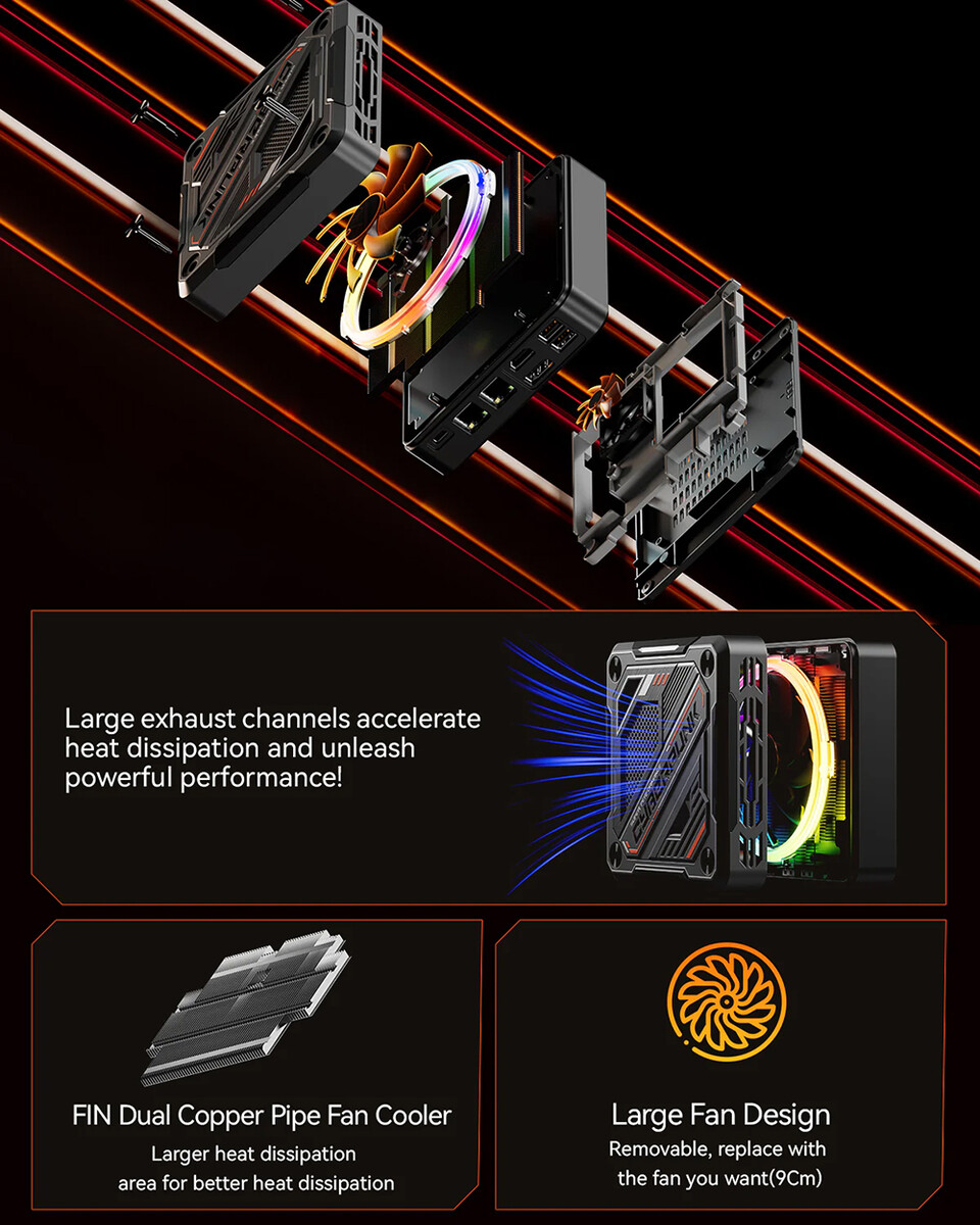 Jeśli chodzi o konstrukcję, jest ona podobna do jego poprzednikówz obudową o tematyce cyberpunkowej. Inne zalety mini PC GOD88 obejmują podwójny miedziany system chłodzenia z dużym wentylatorem, oświetlenie RGB i obsługę potrójnych wyświetlaczy 4K. Więcej informacji znajdą Państwo w pełnej specyfikacji załączonej poniżej.