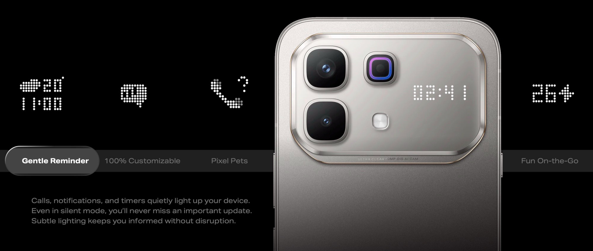 Obudowa posiada również kilka unikalnych elementów. Po pierwsze, programowalny przycisk akcji, który może między innymi uruchomić asystenta AI lub otworzyć aplikację aparatu. Po drugie, wyświetlacz z matrycą punktową w module kamery, który może wskazywać przychodzące wiadomości, pokazywać godzinę lub wyświetlać wirtualnego zwierzaka. Wreszcie, "Health Monitor" - to, co wygląda jak spust migawki aparatu, jest w rzeczywistości czujnikiem tętna i SpO2. Aby dokonać pomiaru, wystarczy przyłożyć palec do tego czujnika na 30 sekund
