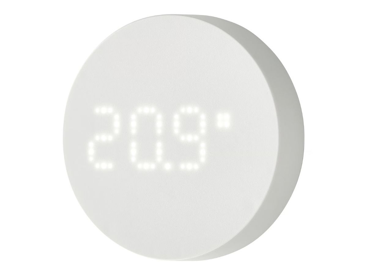 Timmerflotte IKEA to okrągłe urządzenie z cyfrowym wyświetlaczem z przodu. Użytkownicy mogą przełączać się między pomiarami aktualnej temperatury i poziomu wilgotności w pomieszczeniu, naciskając przycisk. Urządzenie zostało zaprojektowane tak, aby można je było podłączyć do huba IKEA Dirigera, umożliwiając zdalne zarządzanie i łączenie inteligentnych urządzeń za pośrednictwem inteligentnej aplikacji IKEA Home.
