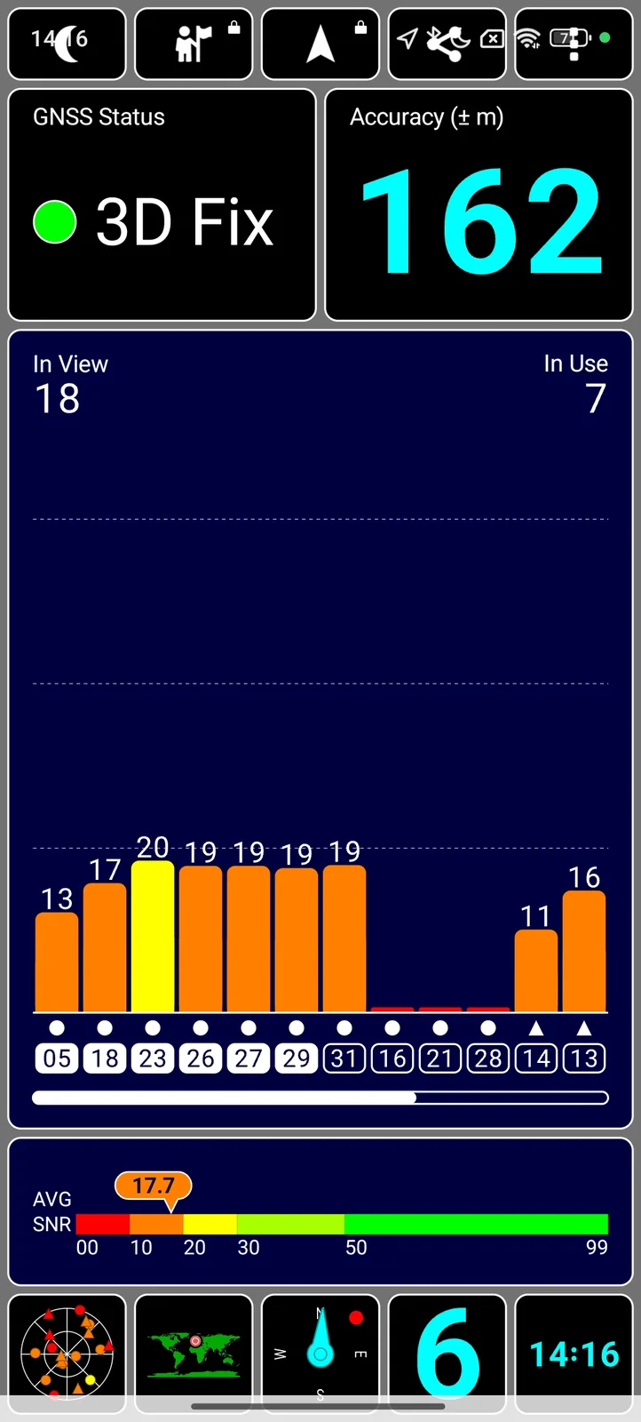 Do pozycjonowania dostępny jest tylko jednopasmowy GNSS z czterema systemami satelitarnymi. Mimo to, lokalizacja satelitów na zewnątrz jest osiągana szybko i z dobrą dokładnością.