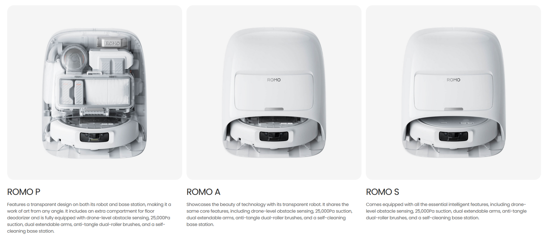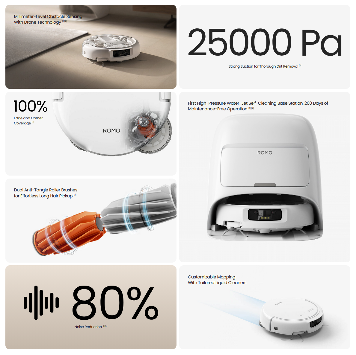 DJIzupełnie nowy Romo to pierwszy robot odkurzający typu "wszystko w jednym", który zapożycza technologię czujników i nawigacji z pracy dronów firmy. Linia ta ukierunkowana jest na dokładne czyszczenie twardych podłóg i dywanów, z trzema modelami i silnym naciskiem na unikanie przeszkód, samoobsługę i silne ssanie.