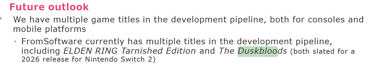 Kadokawa zamieściła aktualizację w swoim raporcie Q3 Fiscal Year 2026. Omawiając spadające zyski operacyjne w porównaniu z rokiem poprzednim, odniosła się do Gry Switch 2. The Duskbloods i Elden Ring Tarnished Edition "mają zostać wydane w 2026 roku"