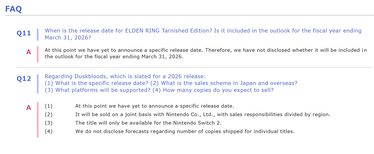Zdając sobie sprawę, że inwestorzy będą mieli więcej pytań, firma odniosła się do obu tytułów w FAQ. Niestety, nie zawęziła czasu przybycia wysiłków FromSoftware. Odmówiła również podania prognoz sprzedaży, choć handheld Nintendo może przynieść wzrost finansowy.